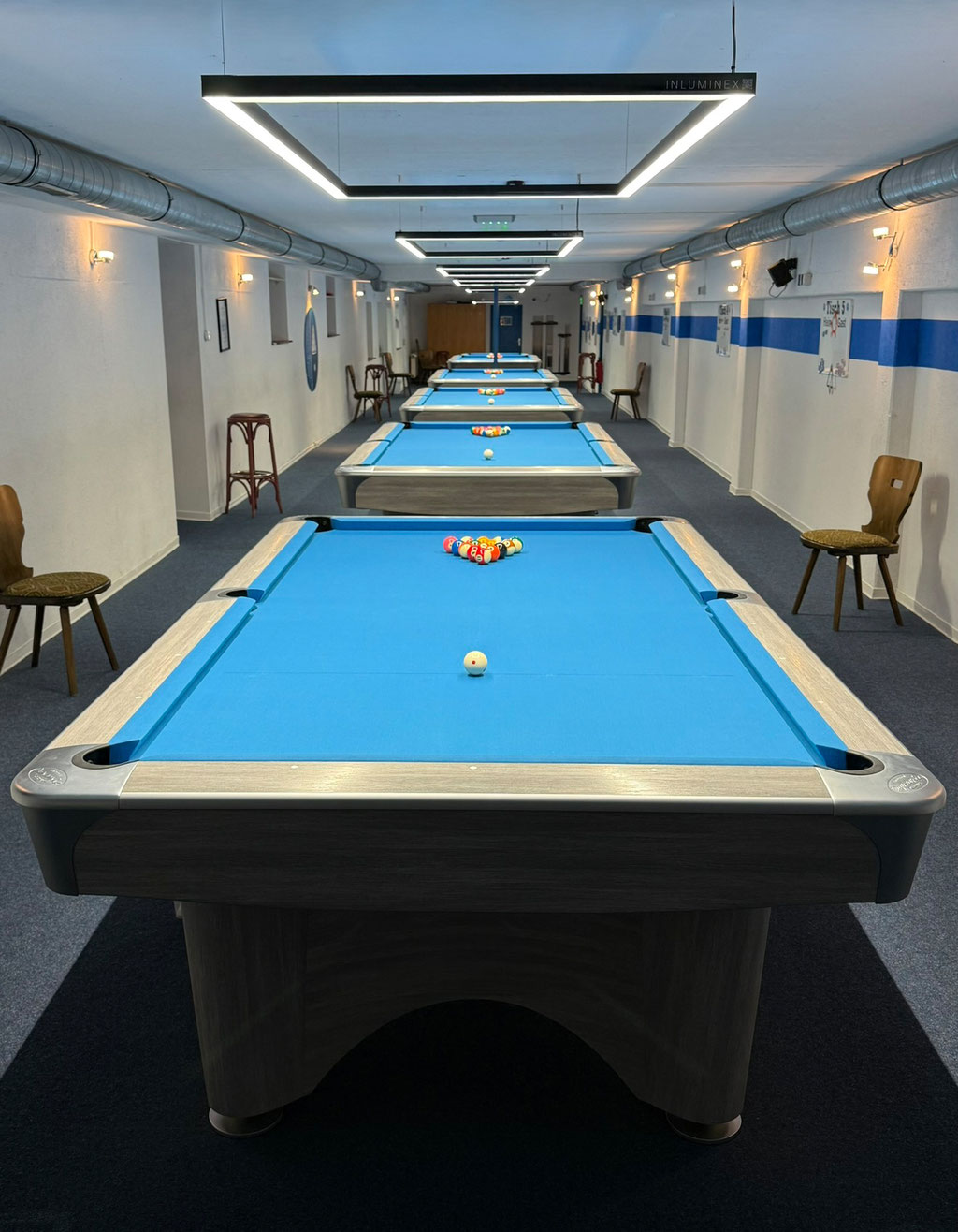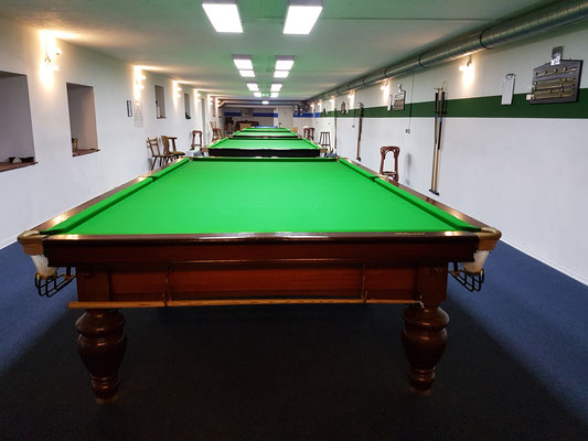 Wir spielen auf vier Snookertischen und sieben Dynamic III Pooltischen.